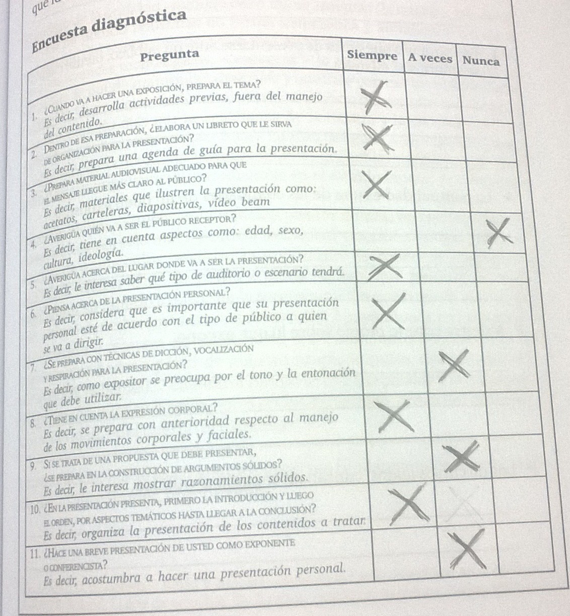 Considero que me preparo siempre para realizar una exposición pero al realizar esta encuesta me doy cuenta que hay aspectos que no tengo en cuenta y pueden dificultar un poco la explicación del tema, por ello me asegurare de tener conocimiento del público antes dictar la charla también estaré atenta a mis movimientos corporales y a mi tono de voz ya que si mi público se fija más en ello no prestaran atención al tema; a veces me enfoco más en la exposición del tema y se me olvida mi presentación procurare tener presente que cada exposición va primero la presentación.