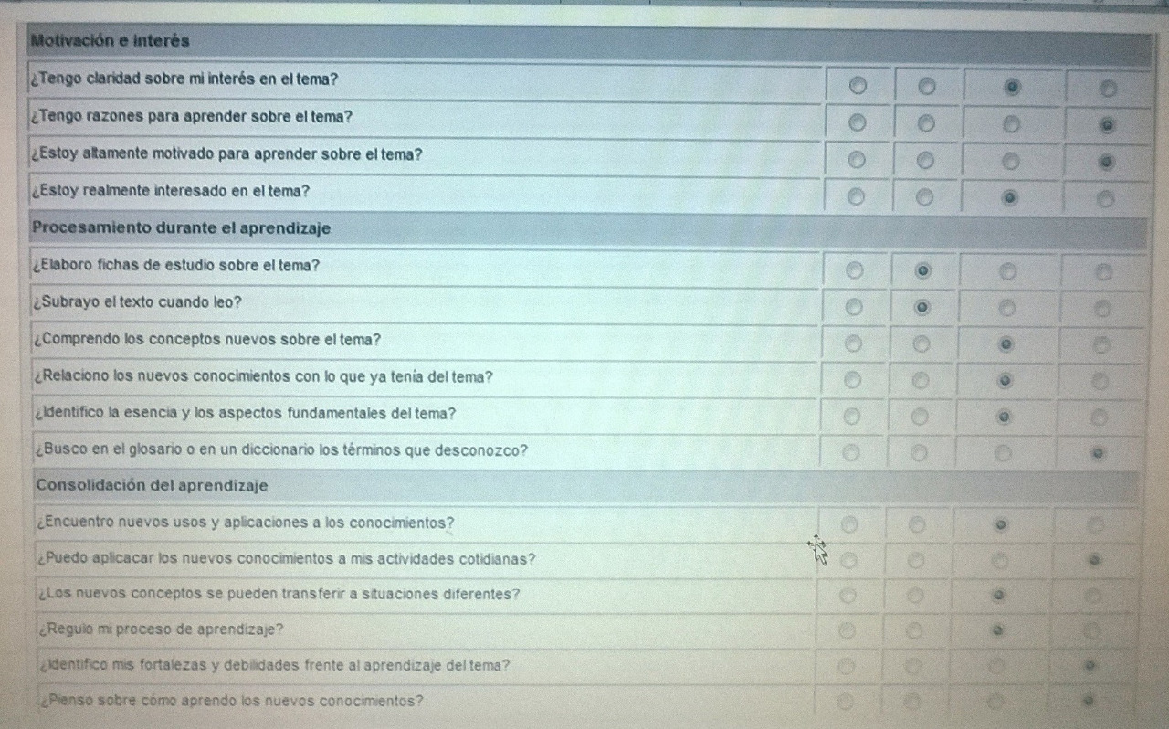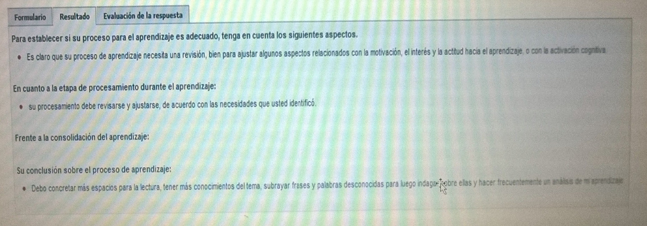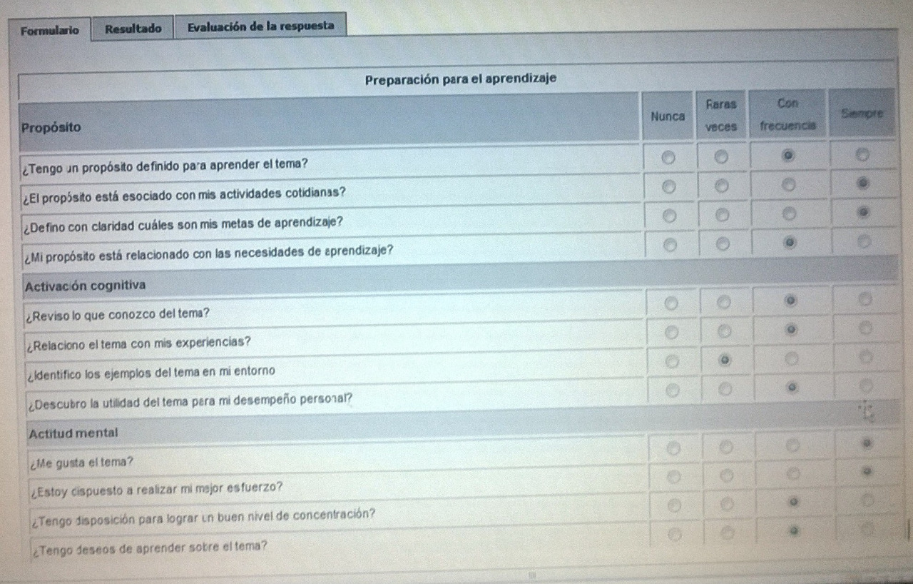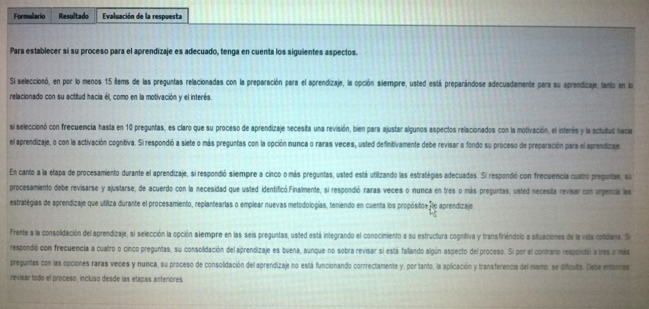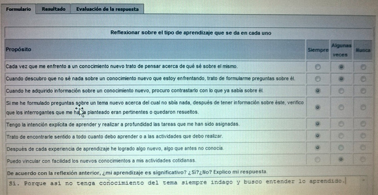 Si usted contestó entre una y tres preguntas con la opción nunca, es el momento de revisar cuidadosamente su proceso de aprendizaje, especialmente en lo relacionado con la forma como intenta activar sus conocimientos previos, cuando enfrenta una situación de aprendizaje y en cómo relaciona la nueva información, pues evidente que no esta aprendiendo significativamente.