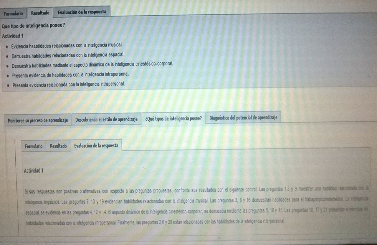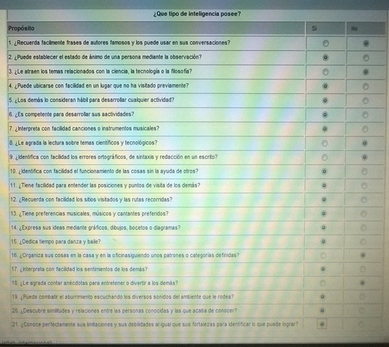Si sus respuestas son positivas o afirmativas con respecto a las preguntas propuestas, confronte sus resultados con el siguiente control. Las preguntas 1.8 y 9 muestran una habilidad relacionada con la inteligencia linguistica. Las preguntas 7, 13 y 19 evidencian habilidades relacionadas con la inteligencia musical. Las preguntas 3, 8 y 16demuestran habilidades para el trabajologicomatemático. La inteligencia espacial, se evidencian en las preguntas 4, 12 y 14. El aspecto dinámico de la inteligencia cinestésico-corporal, se demuestra mediante las preguntas 5, 10 y 15. Las preguntas 10, 17 y 21 presentan evidencia de habilidades relacionadas con la inteligencia intrapersonal. Finalmente Las preguntas 2, 6 Y 20 estan relacionadas con las habilidades de la inteligencia interpersonal.