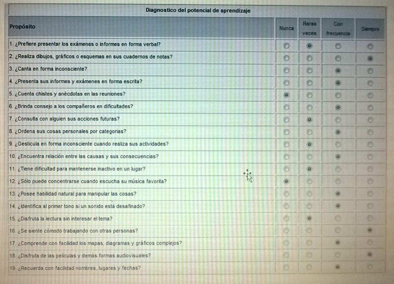 Las respuestas de siempre o con frecuencia en las preguntas 3, 12, 14, 22, 23 y 34 muestran evidencia de una inteligencia musical. Si contesto siempre o con frecuencia en las preguntas 8, 10 y 37 el predominio es de la inteligencia logicomatemática.