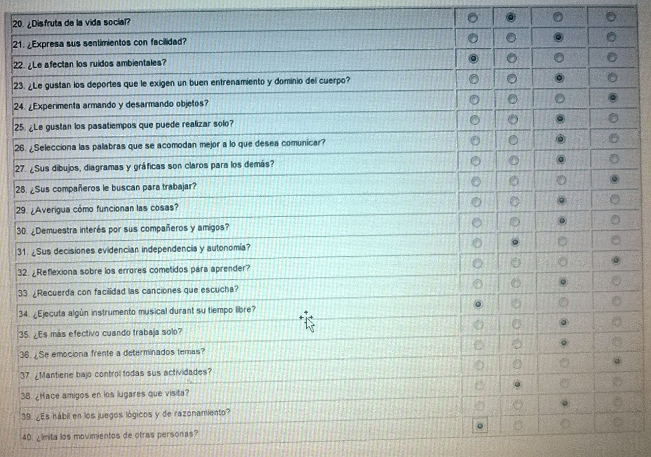 Una respuestas de siempre o con frecuencia en las preguntas 16, 28, 30 y 38 sugieren la inteligencia interpersonal. Una respuestas de siempre o con frecuencia en las preguntas 11, 23 y 40 establecen el predominio de una inteligencia cinestesicocorporal.