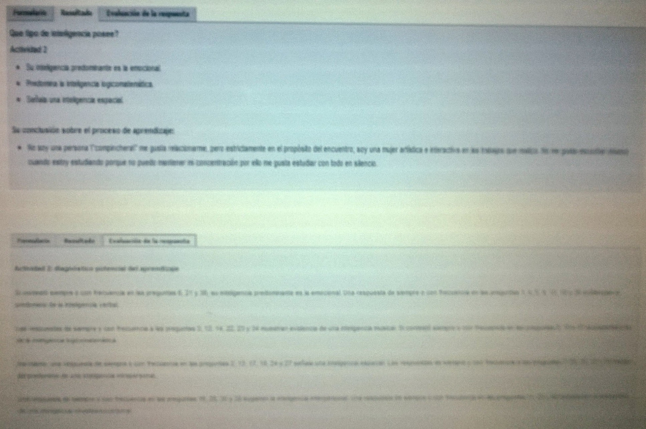 Así mismo una respuesta de siempre o con frecuencia en las preguntas 2, 13, 17,18, 24 y 27 señalan una inteligencia espacial. Las respuestas de siempre o con frecuencia en las preguntas 7, 25, 31, 32 y 35 hablan del predominoo de una inteligencia intrapersonal.