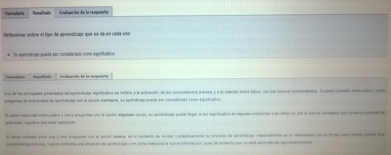 Uno de los principales postulados del aprendizaje significativo se refiere a la activación de los conocimientos previos y a la relación entre éstos, con los nuevos conocimientos. Si usted contesto entre cinco y ocho preguntas de la actividad de aprendizaje con la opción siempre, su apéndizaje puede ser conciderado como significativo.